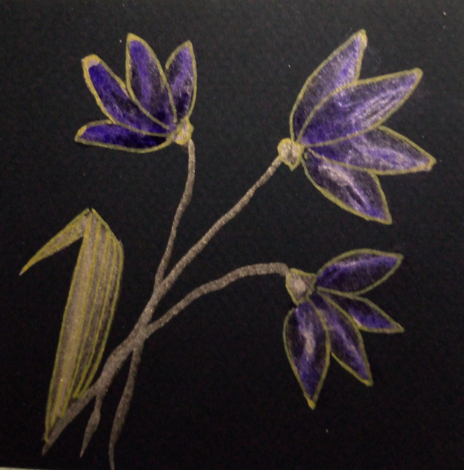 Trois fleurs, encres, feutre doré, 10×10 cm, 28/01/25